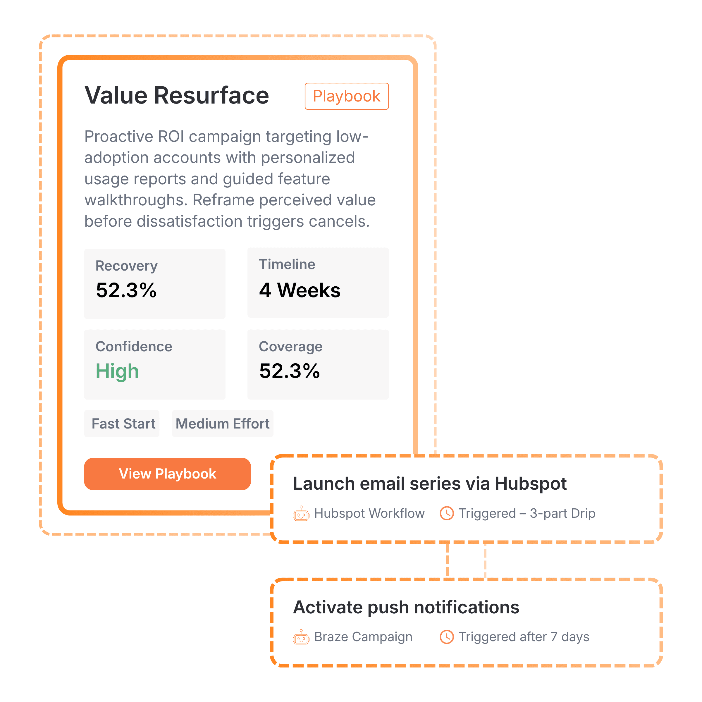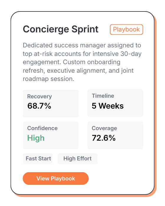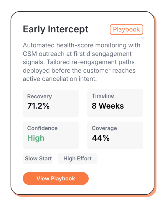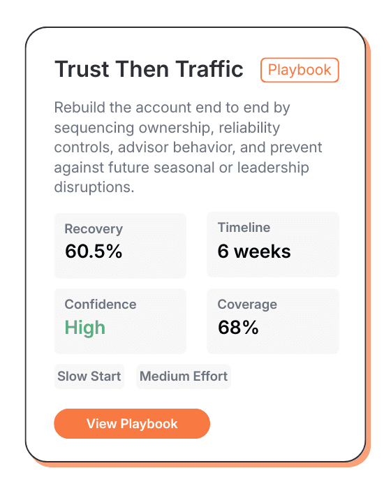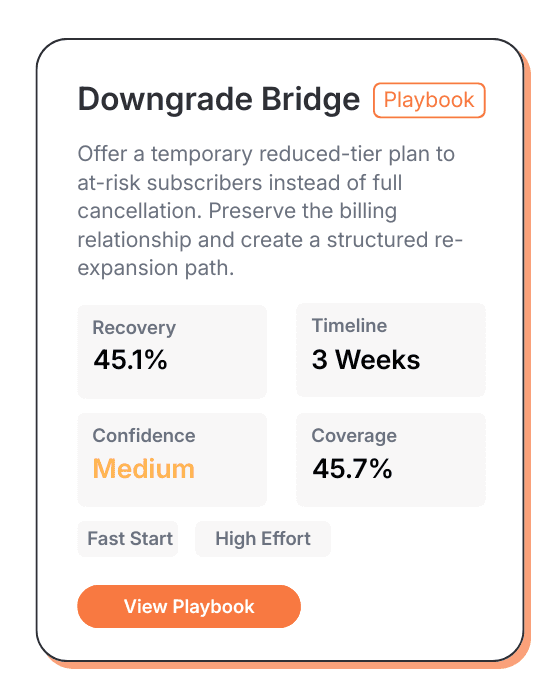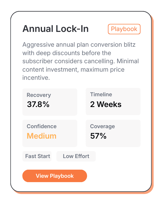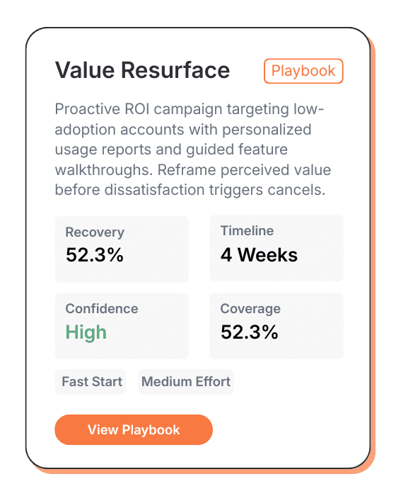 Structured, ranked playbooks with predicted impact and grounded reasoning. Built to hand off and execute, not a report your team has to interpret.